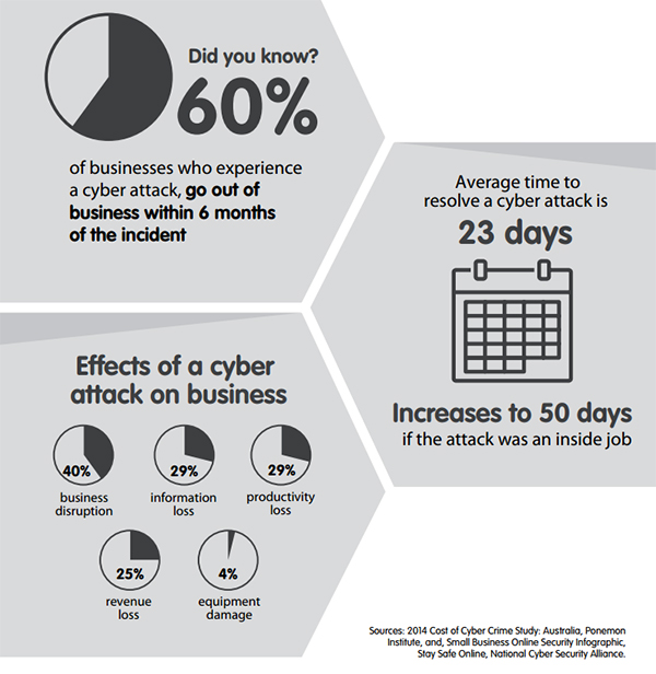 Did you know that 60 per cent of businesses who experience a cyber attack go out of business within six months of the incident? Or that the average time to resolve a cyber attack is 23 days? And that number increases to 50 days if the attack was an insider job*?