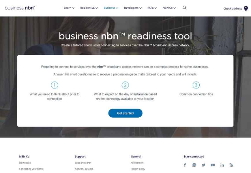 Conveniently located online and free to use, the business nbn™ readiness tool helps by creating a tailored checklist for connecting to services over the nbn™ access network.