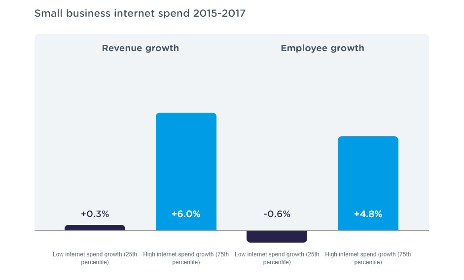 Spending on internet services had the most powerful effect on business performance, with companies with the highest internet spending growth, increasing revenue 5.7 percentage points more, and employment 5.4 percentage points more than those in the bottom quartile of technology spending growth.
