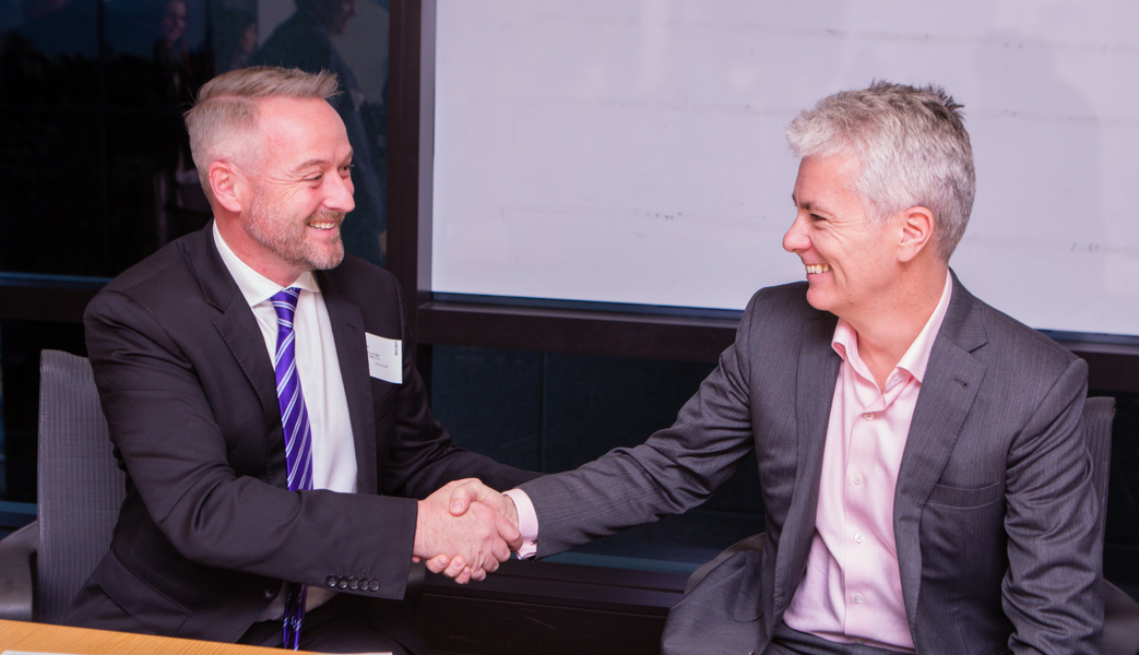 Luke Clifton (left), Macquarie Telecom Group Executive, and Paul Tyler, NBN Co's Chief Customer Officer – Business.