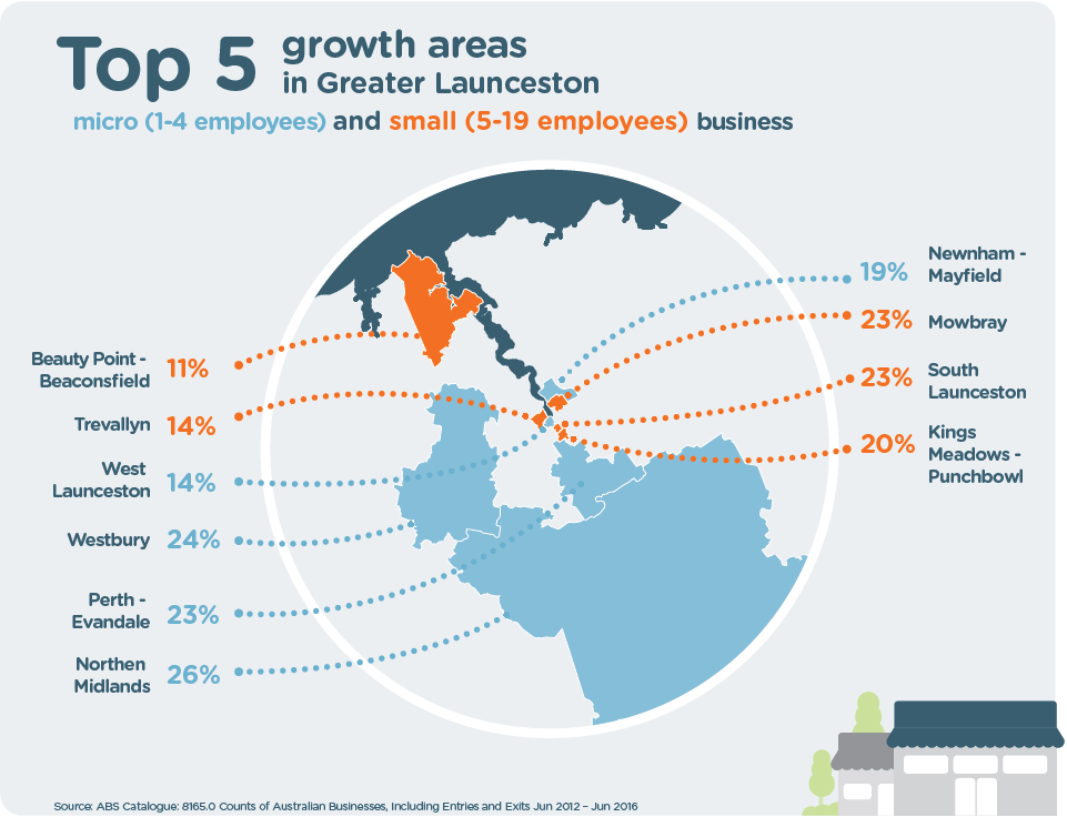 Regions and suburbs playing a part in this growth include Campbell Town, Perth-Evandale and rural Westbury. The increase in micro-businesses in these areas between 2014 and 2016 has been between 20 and 25%, respectively.