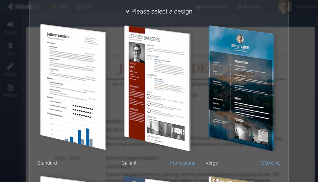VisualCV is a site that enables you to create a professional resume, online portfolio or personal landing page. There are a number of professional designs to choose from, with the option to publish as a CV, a professional website or export to a PDF.