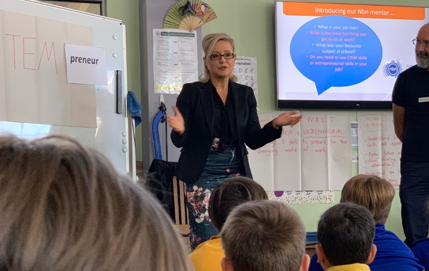 Chief Network Deployment Officer Kathrine Dyer at the launch of the nbn™ STEMpreneur initiative with students from Bowen Road Primary in Hobart