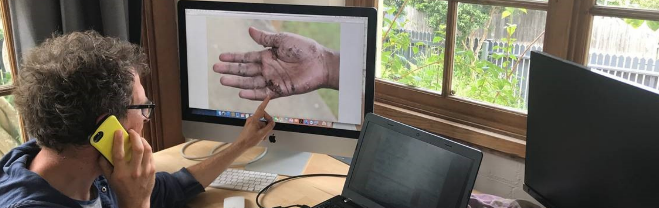 Dr John Kelly conducts a telehealth consult. Image courtesy of Simbani Integrated Research.
