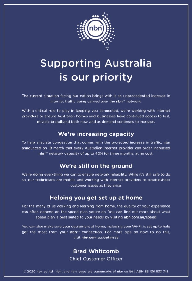 NBN Co exists to help Australian households and businesses make the most of the benefits of high-speed broadband. Our commitment, as the team behind the nbn™ access network, is to ensure we can support Australia through this time of crisis – so that when it is over, we all emerge in a position of strength and resilience.