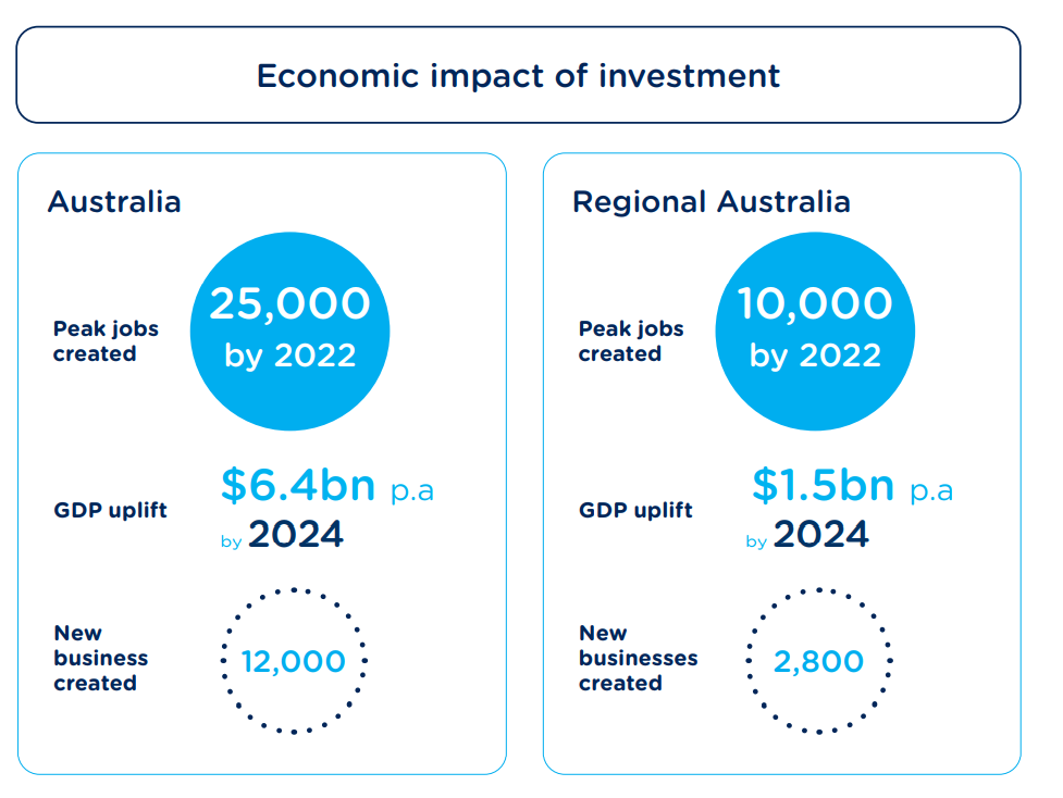 As part of our Corporate Plan 2021, we are investing $4.5 billion, funded entirely by private debt and starting work immediately. This investment into the digital backbone of the nation is forecast to create 25,000 additional jobs in Australia.
