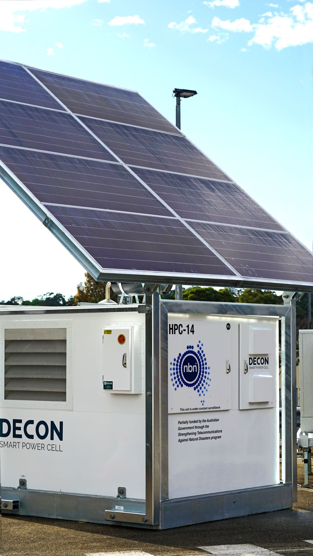 What is it? An environmentally friendly, hybrid technology power generation unit combining solar panels, battery, and a compact diesel generator. Designed in collaboration with nbn delivery partner Decon Technologies, it provides solar power to Fixed Wireless hub sites during the day and, for power resilience, relies on excess battery and grid power at night.