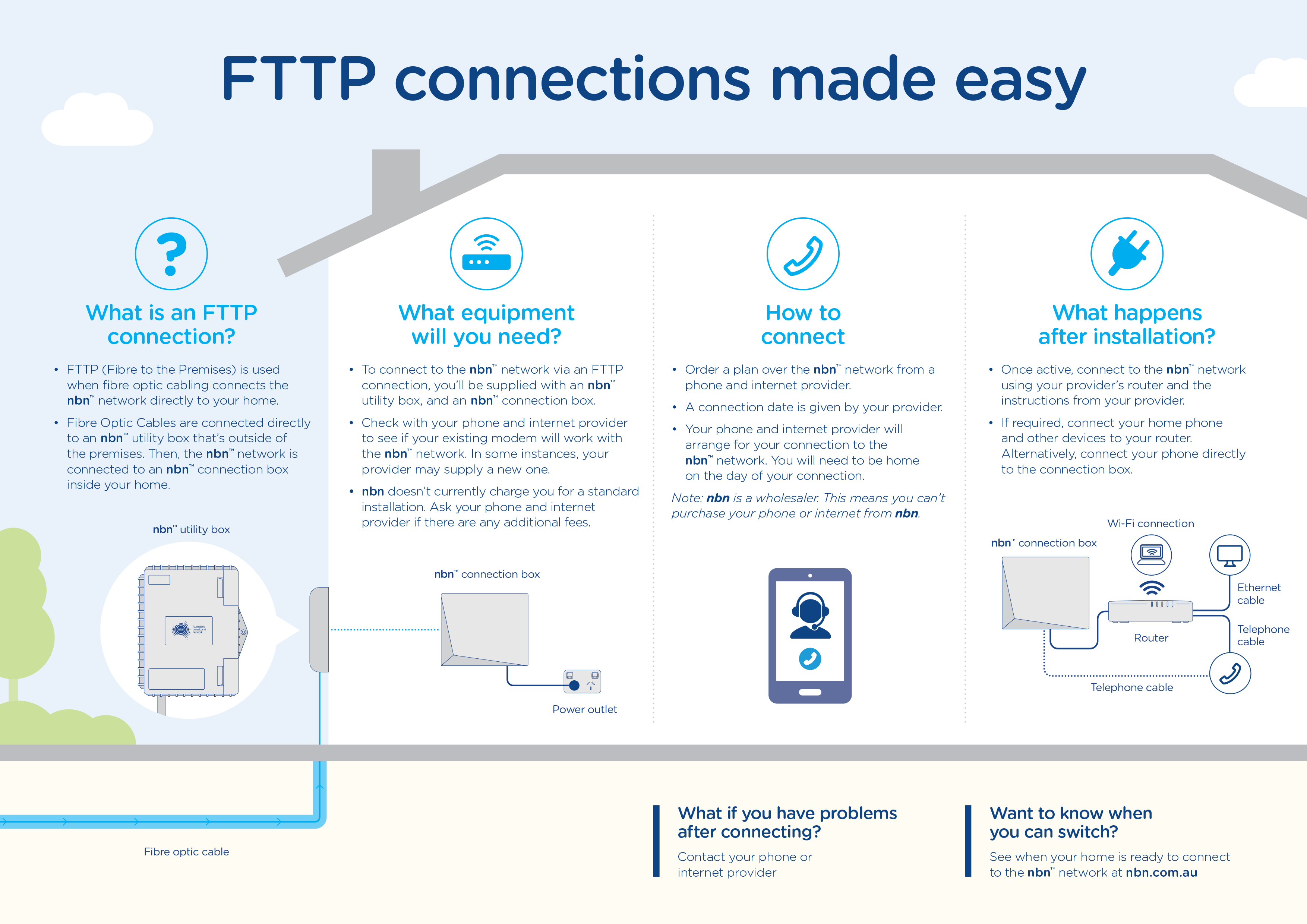 With Fibre to the Premises (FTTP), nbn supplies and installs a connection box within your home or business which requires power to operate. Optional battery backup is available from nbn, but you need to speak to your service provider to order a telephone service that uses the battery backup.