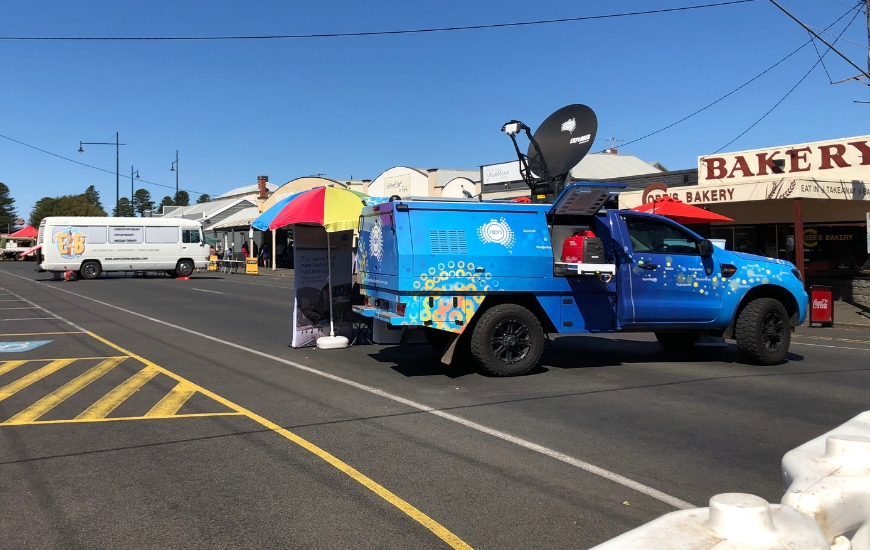 At the festival, the Road Muster truck provided secure Wi-Fi to the box office, media, bars and food outlets, as well as offering a direct connection via local area network to the event organisers. Among the ‘firsts’ this year was the ability for media to submit reports including video to news outlets, Facebook live streaming of the start of the triathlon, and payWave on EFTPOS, all via the Sky Muster™ satellite connection through the Road Muster truck.*