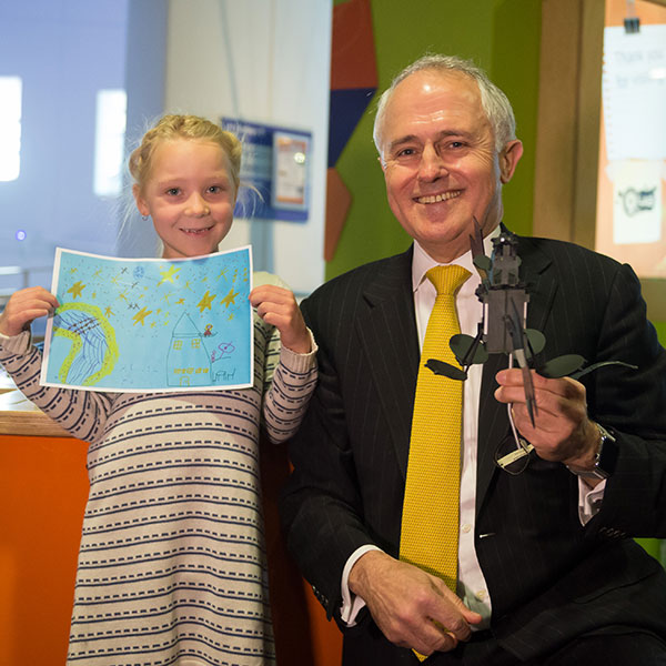 Six-year-old Bailey Brooks with Minister of Communications, Malcolm Turnbull.