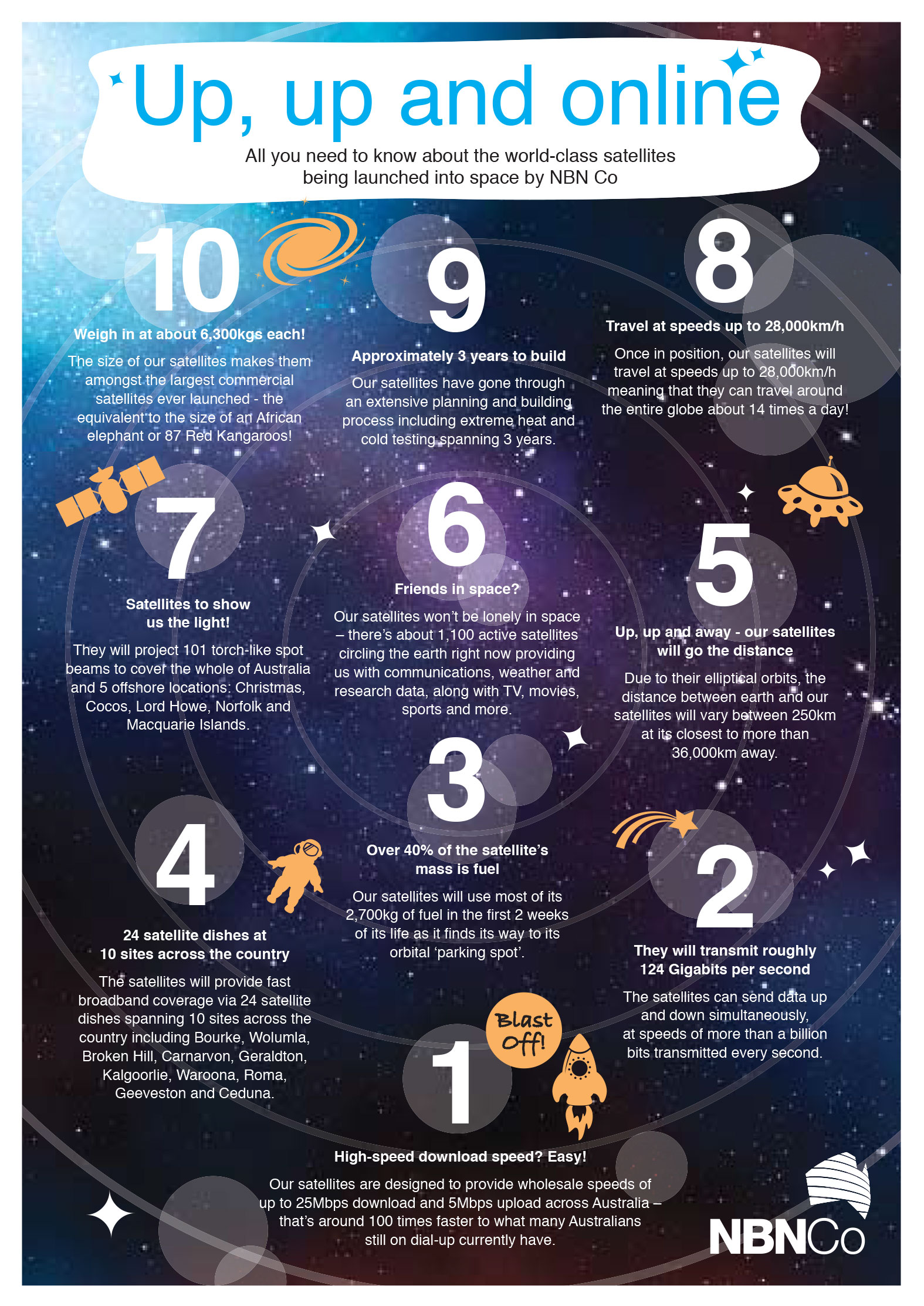 Sky Muster will be the first of two satellites which nbn will send into space, with the launch currently scheduled within the next year. This satellite will play a crucial part in levelling the playing field between city and bush by helping to deliver fast broadband services to around 200,000 homes and businesses in Australia.
