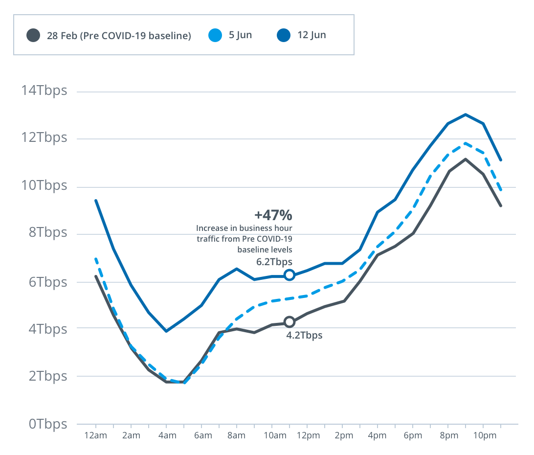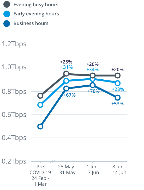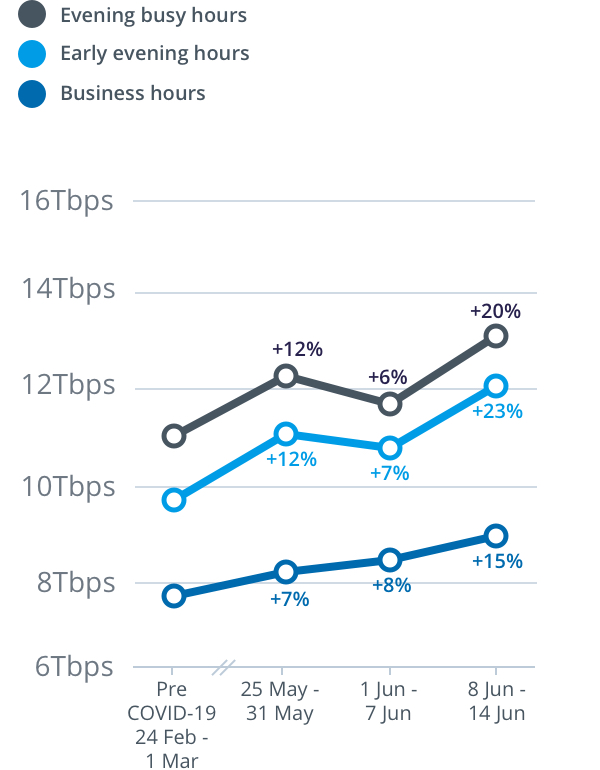 Peak download throughput during the week beginning Monday, 8 June also increased compared to the pre-COVID-19 baseline during daytime business hours, up 15 per cent to 8.9Tbps, and during early evening hours, up 23 per cent to 12.1Tbps, on the main nbn™ wholesale service.