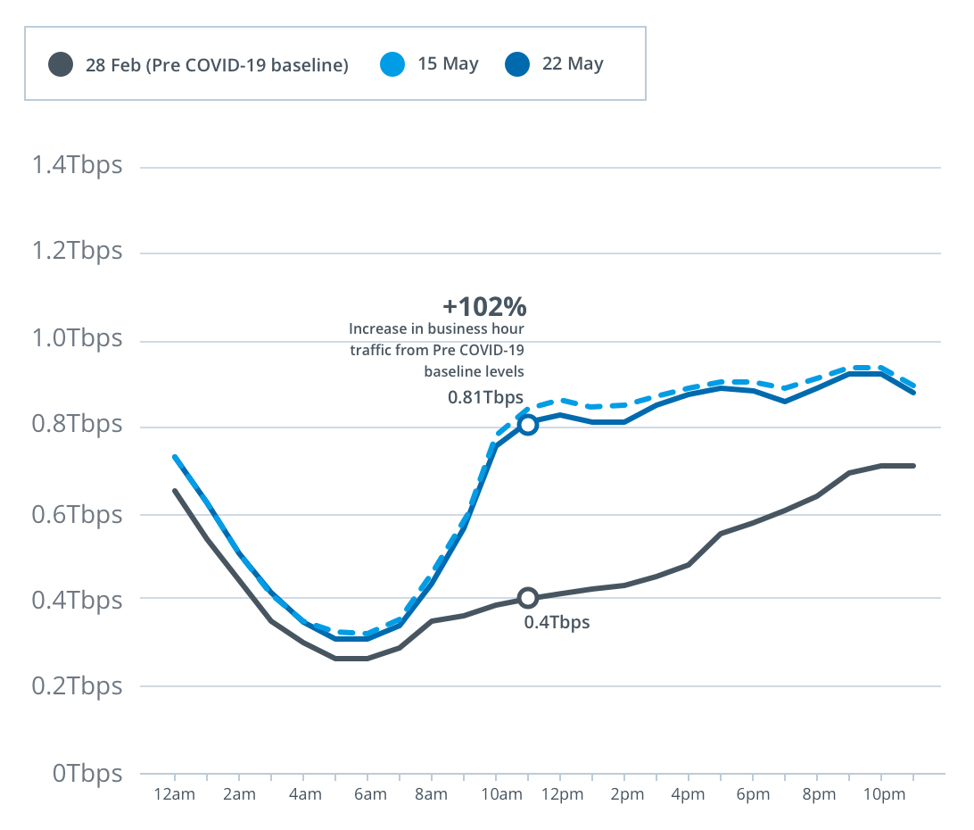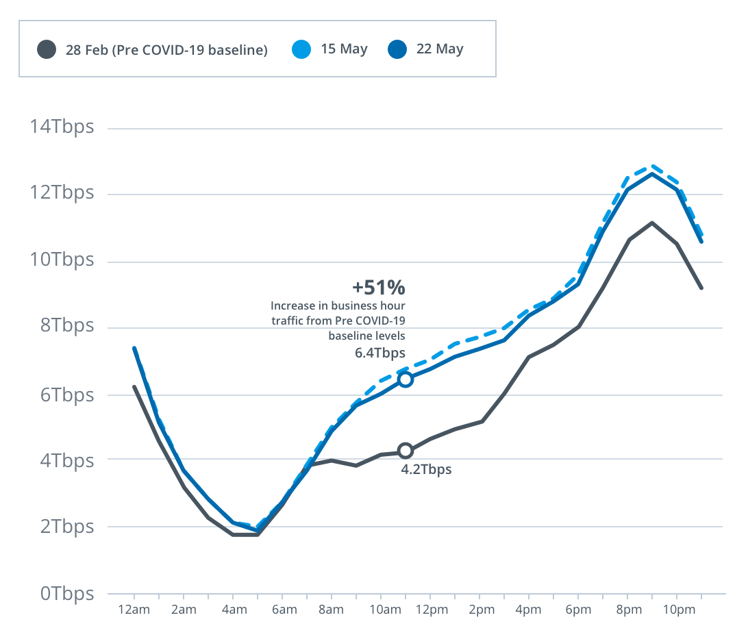 Compared to the pre-COVID-19 baseline, peak upload throughput on the main nbn wholesale service in the evening busy hours for the week beginning 18 May increased by 36 per cent to 1.02Tbps; peak upload throughput in the early evening hours increased 42 per cent to 0.96Tbps; and peak throughput during daytime business hours increased by 82 per cent to 0.91Tbps.