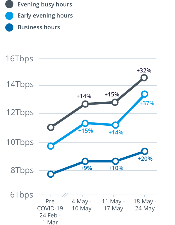 Peak download throughput during the week beginning Monday, 18 May also increased compared to the pre-COVID-19 baseline during daytime business hours, up 20 per cent to 9.4Tbps, and during early evening hours, up 37 per cent to 13.5Tbps, on the nbn main wholesale service.