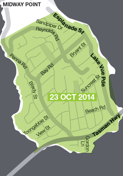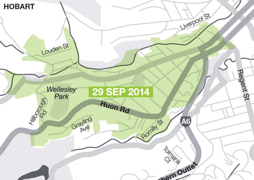 West Hobart, Battery Point, Sandy Bay, Dynnyrne, Herringback, Huonville, Richmond, Sorell, Kingston Beach, Triabunna, South Hobart, Midway Point and Snug