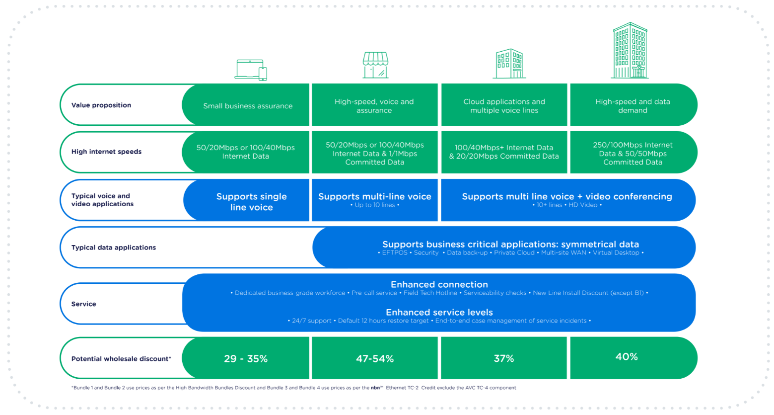 Each of the discount bundles will include a minimum 12 hour enhanced service level agreement with 24/7 support between NBN Co and retailer as well as bandwidth which incrementally increases with higher bundles.