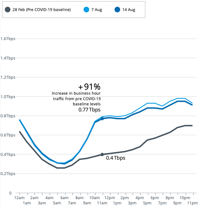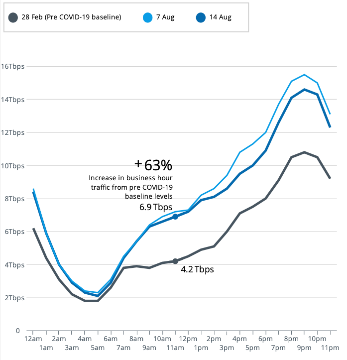 Compared to the pre-COVID-19 baseline before social distancing measures were implemented, downstream network usage on the nbn™ main wholesale service during business hours on 14 August 2020 was 63 per cent higher (as shown in the graph below at 11am) than pre-COVID-19.