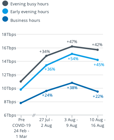 Peak download throughput during the same week also decreased during daytime business hours to 9.5Tbps, down 12 per cent on the peak of the previous week, and the peak in the early evening hours was 14.2Tbps, down 6 per cent on the peak of the previous week.
