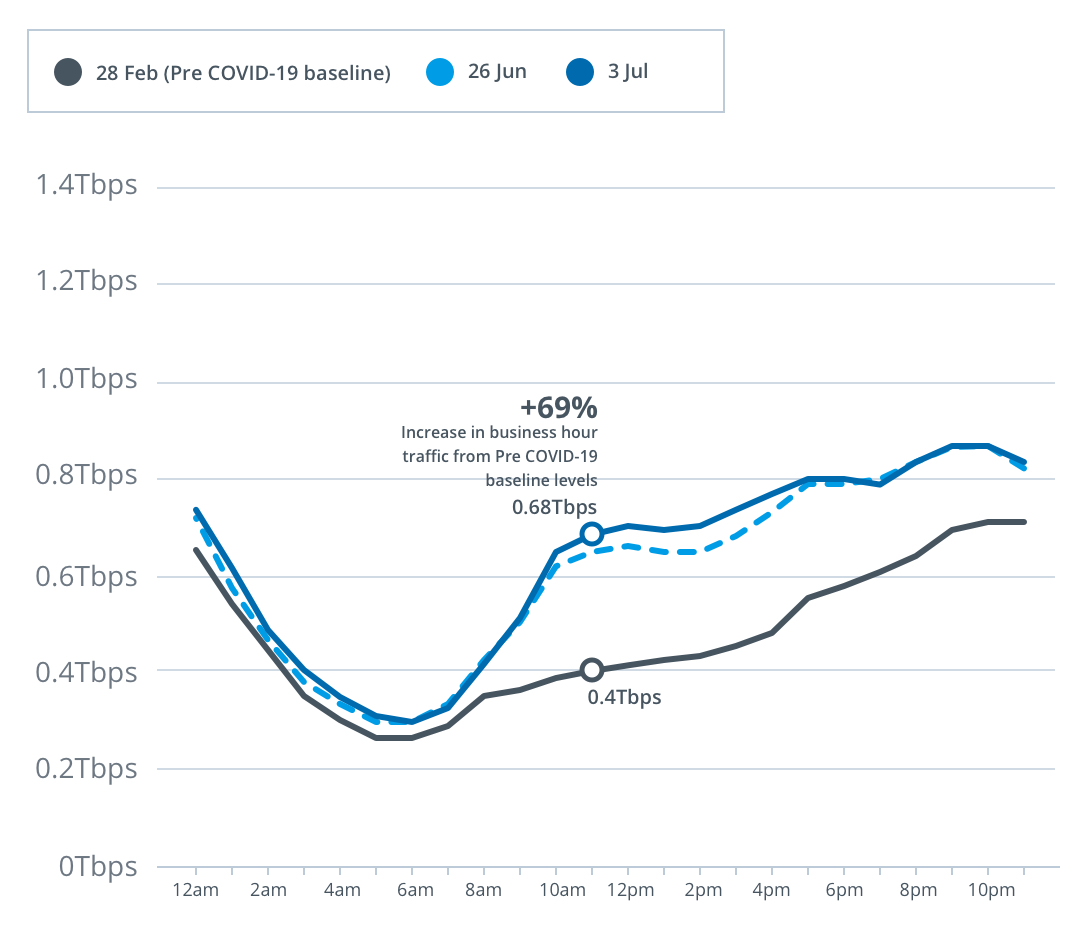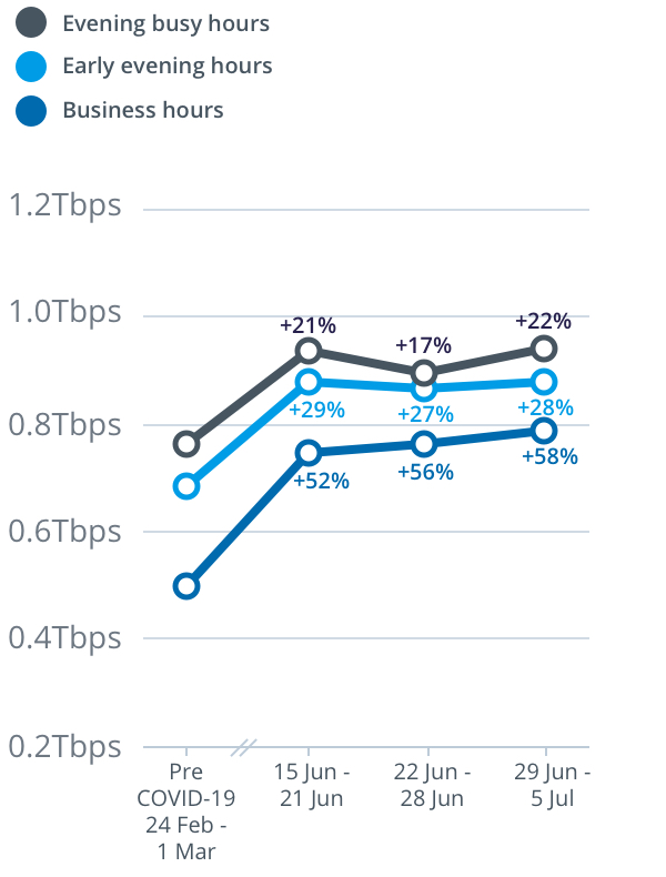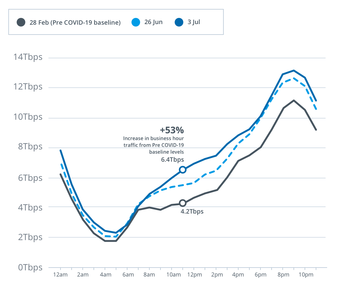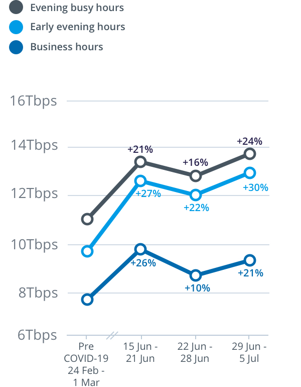 Peak download throughput during the week beginning Monday, 29 June also increased during daytime business hours, up 21 per cent to 9.4Tbps, and early evening hours up 30 per cent to 12.8Tbps, compared to the pre-COVID-19 baseline.