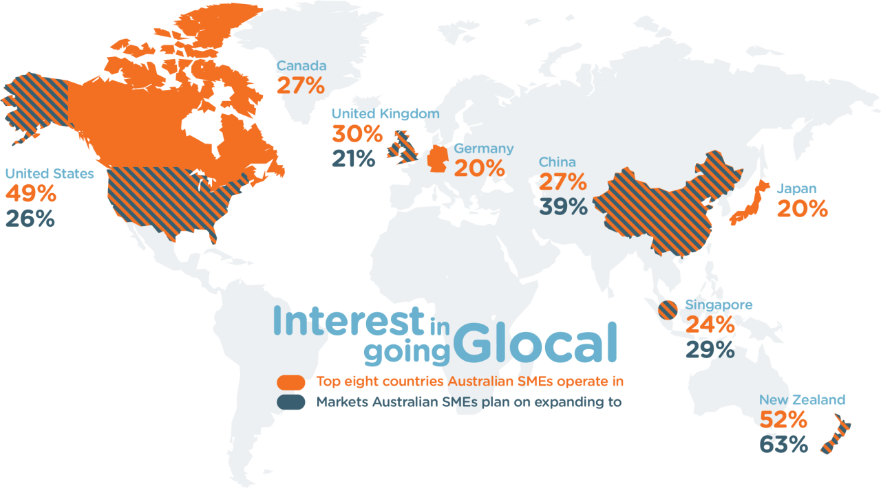 - Making the move abroad: The majority of businesses said setting up legal and financial requirements are the biggest challenges to going 'Glocal' (96 per cent) followed by identifying local sources of support in overseas markets (94 per cent) and overcoming language barriers (92 per cent).