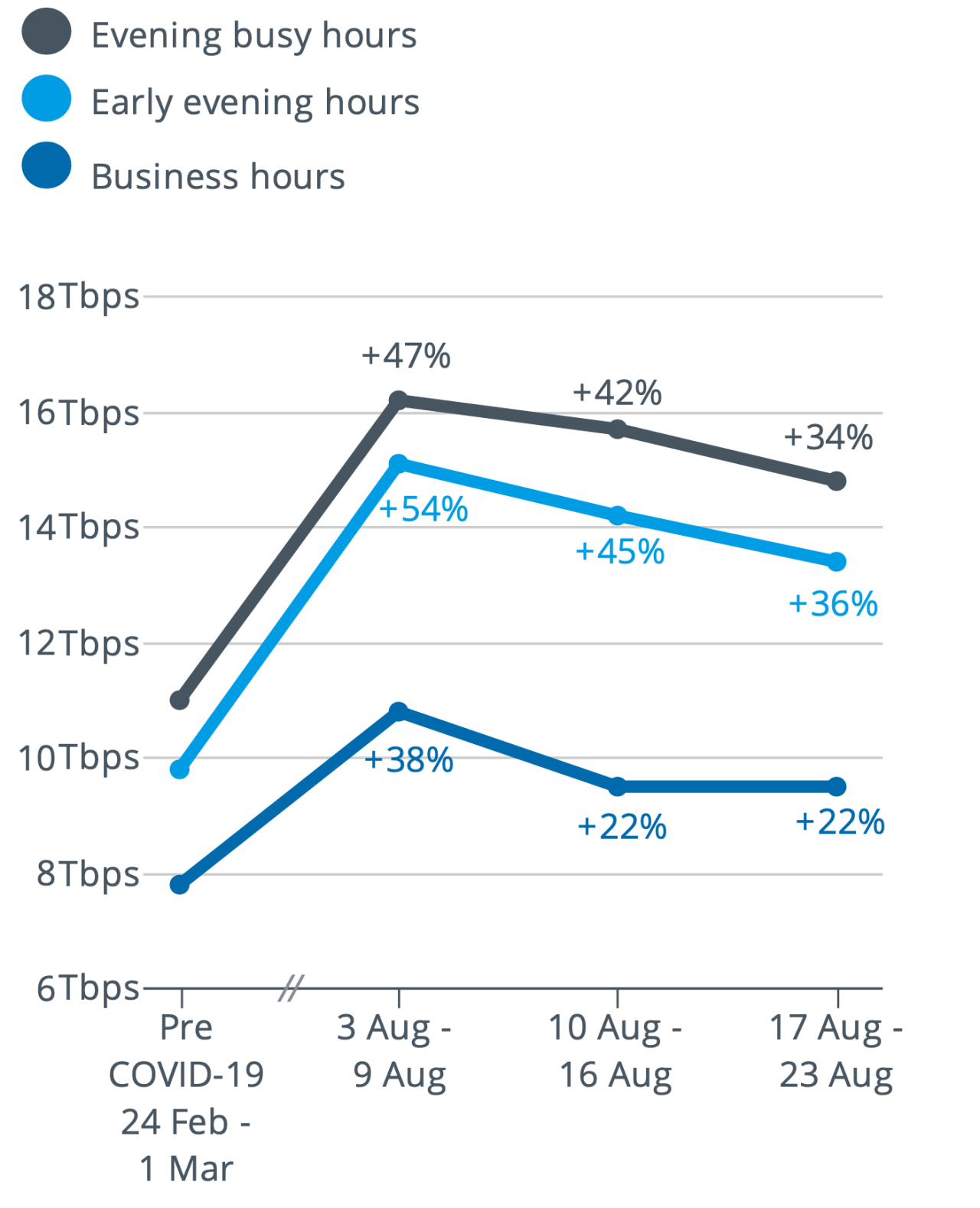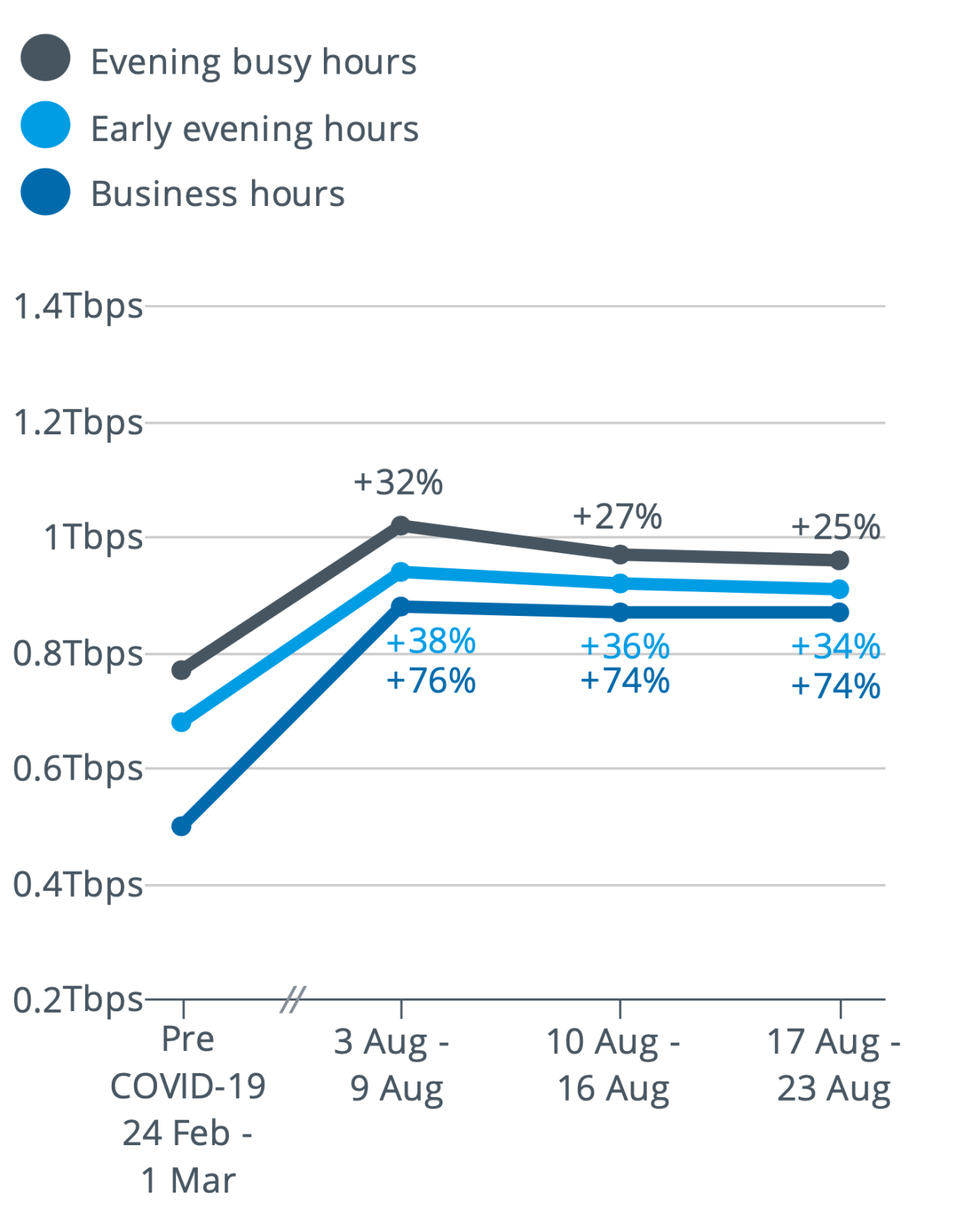 - Weekly download throughput peak of 14.8 Terabits per second (Tbps) recorded on Saturday, 22 August during the evening busy hours