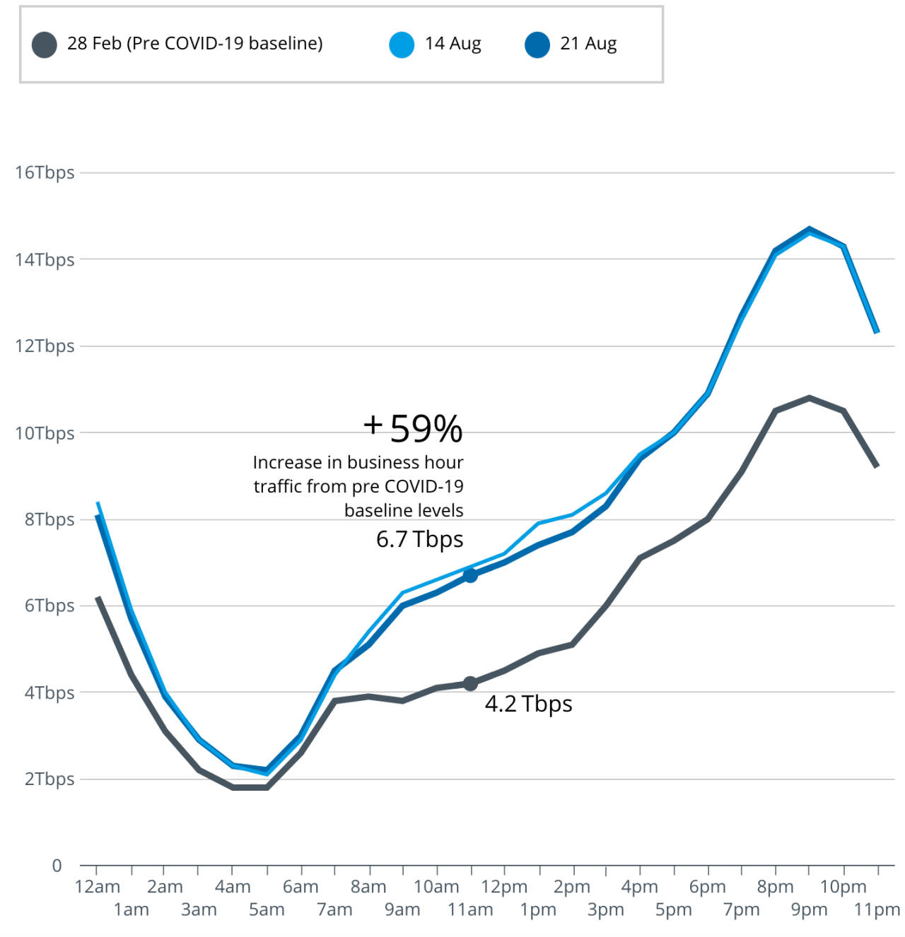 Download throughput during the same week peaked at 9.5Tbps in daytime business hours, consistent with peak download throughput observed in the previous week and at 13.4Tbps in the early evening hours, representing a decline of 5.7 per cent on the peak download throughput of the previous week.