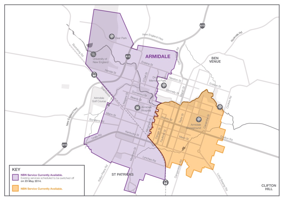 The NBN is scheduled to replace 4,680 existing home and business landline phones, ADSL internet and Telstra cable internet services in parts of Armidale, which will be officially switched off from 23 May 2014. Residents and businesses within this area need to move their existing landline phone and internet services to the NBN ahead of the scheduled disconnection date.*