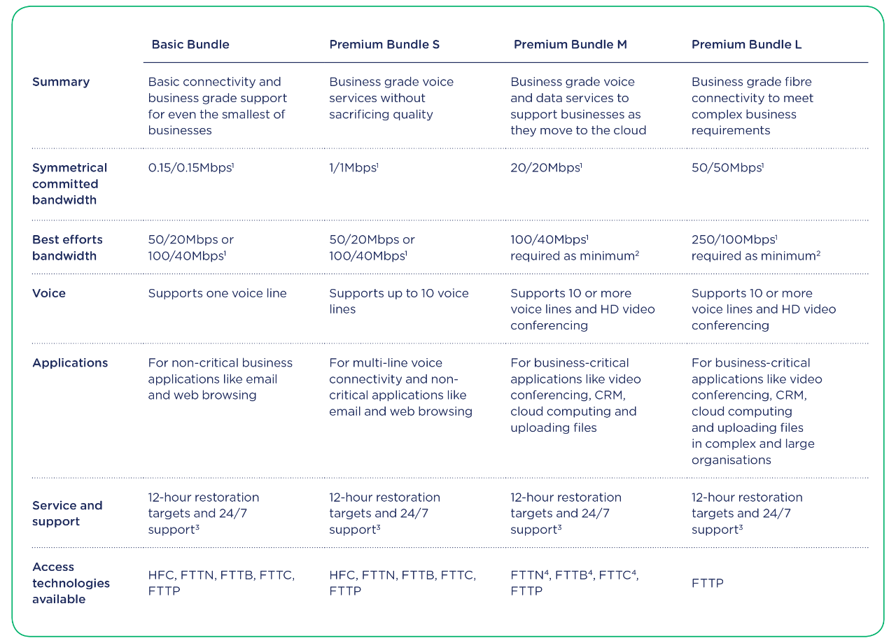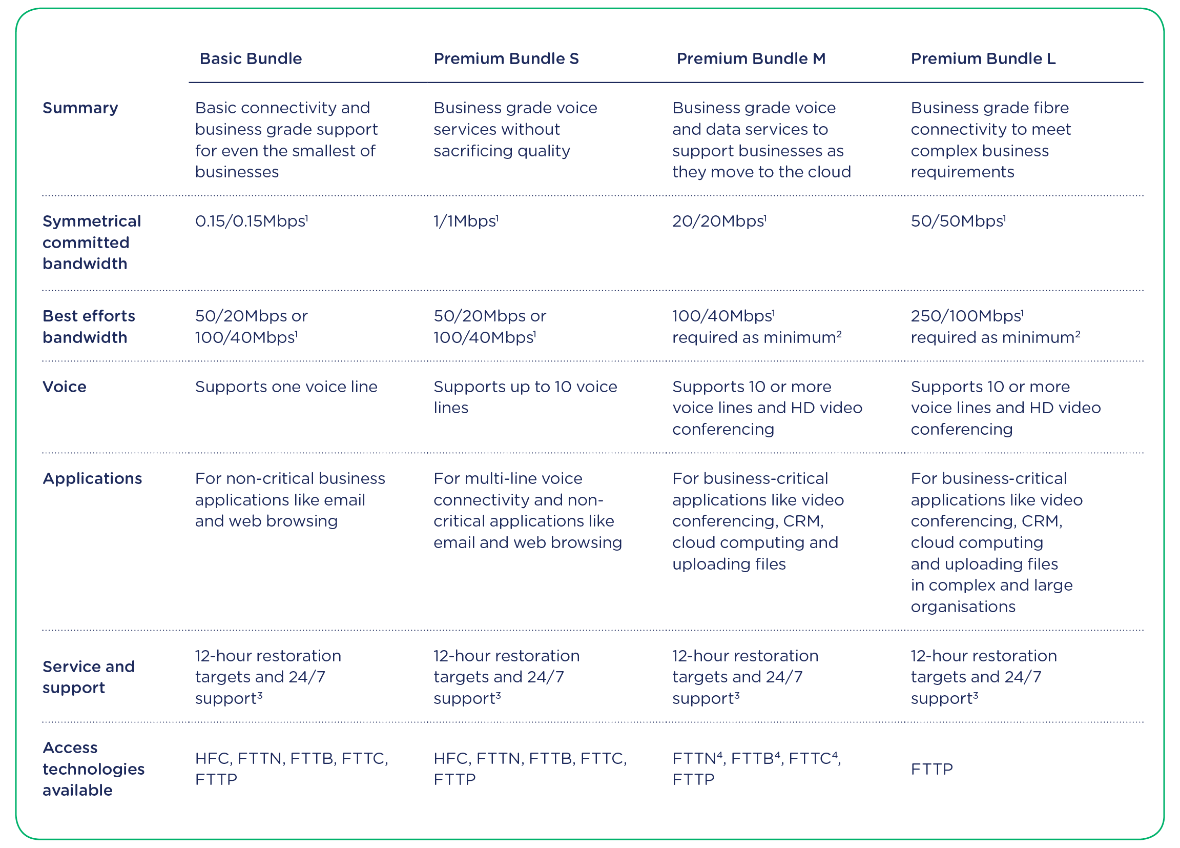 • business nbn™ Premium Bundle S: Wholesale speeds of 50/20Mbps or 100/40Mbps with symmetrical committed speeds of 1/1Mbps designed for multiple phone lines for medium-sized businesses**