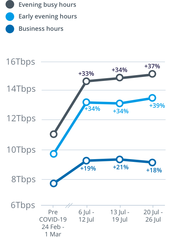 Peak download throughput during the same week also increased during daytime business hours, up 18 per cent to 9.2Tbps, and early evening hours up 39 per cent to 13.6Tbps, compared to the pre-COVID-19 baseline.