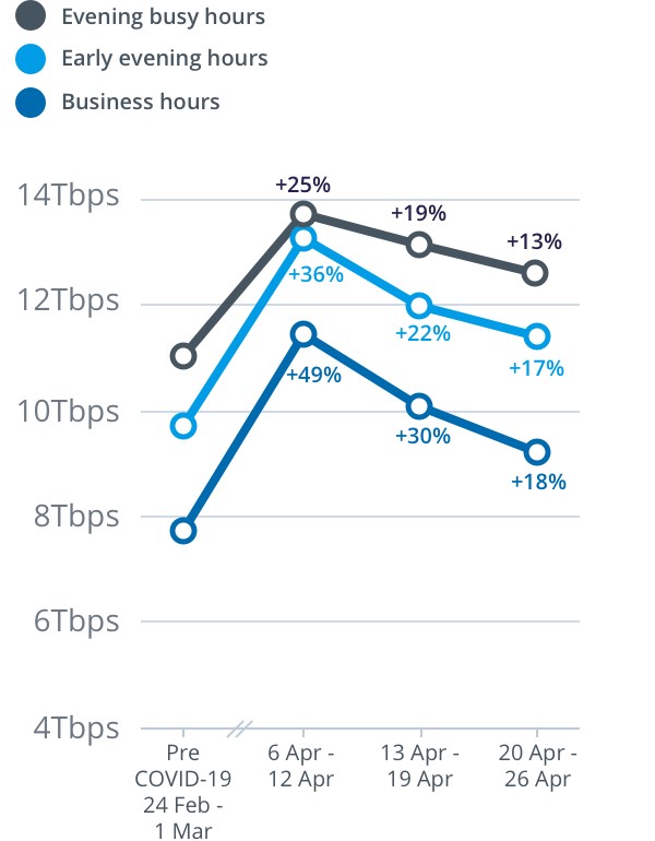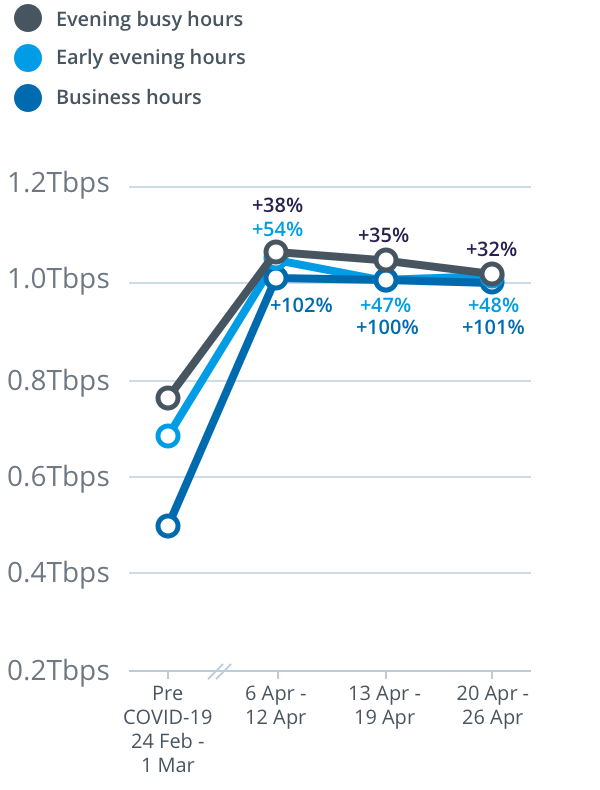 Compared to the pre-COVID-19 baseline, peak upload throughput on the main nbn wholesale service in the evening busy hours for the week beginning 20 April increased by 32 per cent to 1.02Tbps; peak upload throughput in the early evening hours increased 48 per cent to 1.01Tbps; and peak throughput during daytime business hours increased by 101 per cent to 1Tbps.