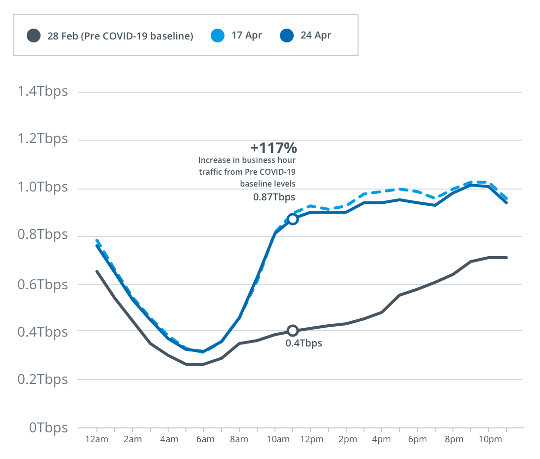 Upstream network usage on the nbn main wholesale service during business hours on 24 April 2020 was 117 per cent higher (as shown in the graph below at 11am) than the pre-COVID-19 baseline.