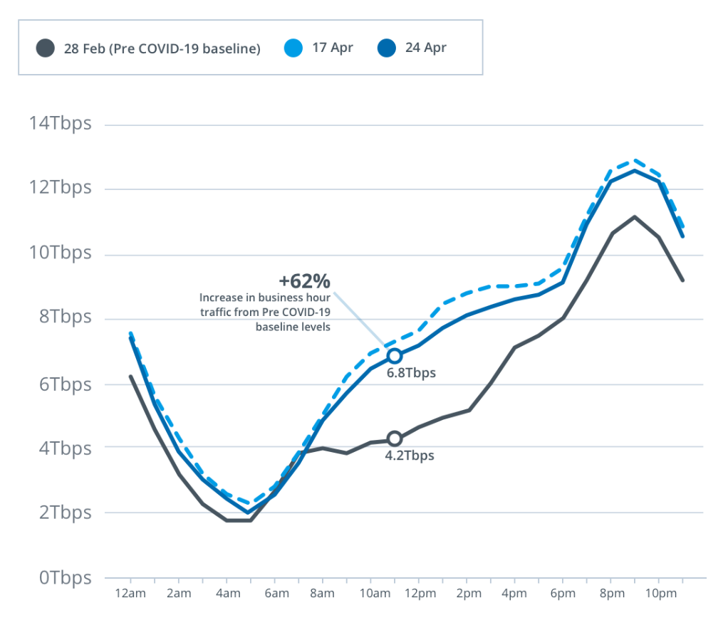 Compared to the pre-COVID-19 baseline before social distancing measures were implemented, downstream network usage on the nbn main wholesale service during business hours on 24 April 2020 was 62 per cent higher (as shown in the graph below at 11am) than the pre-COVID-19 baseline.
