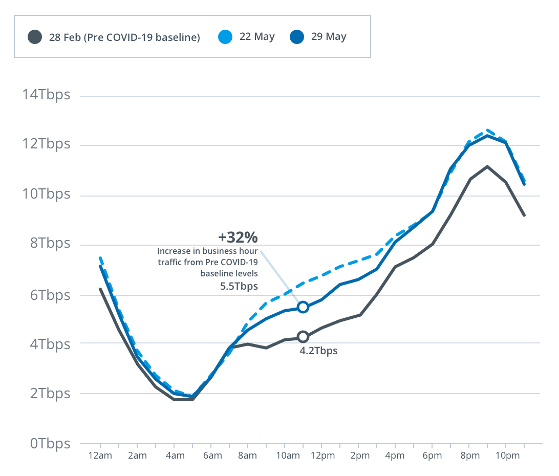 Compared to the pre-COVID-19 baseline before social distancing measures were implemented, downstream network usage on the nbn main wholesale service during business hours on 29 May 2020 was 32 per cent higher (as shown in the graph below at 11am) than the pre-COVID-19 baseline.