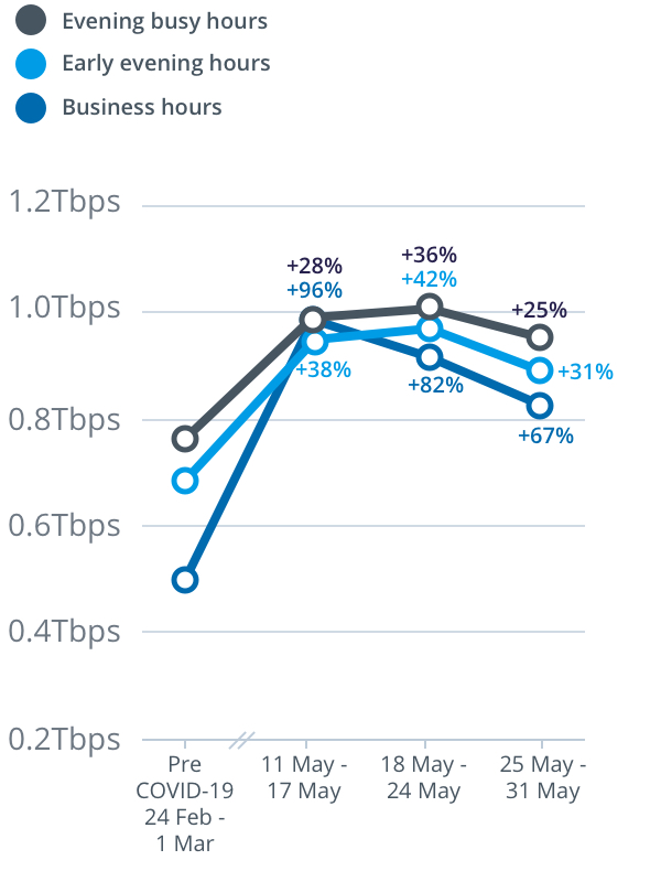 o   Weekly upload throughput peak of 0.96 Tbps recorded on  Tuesday, 26 May during the Evening Busy Hours