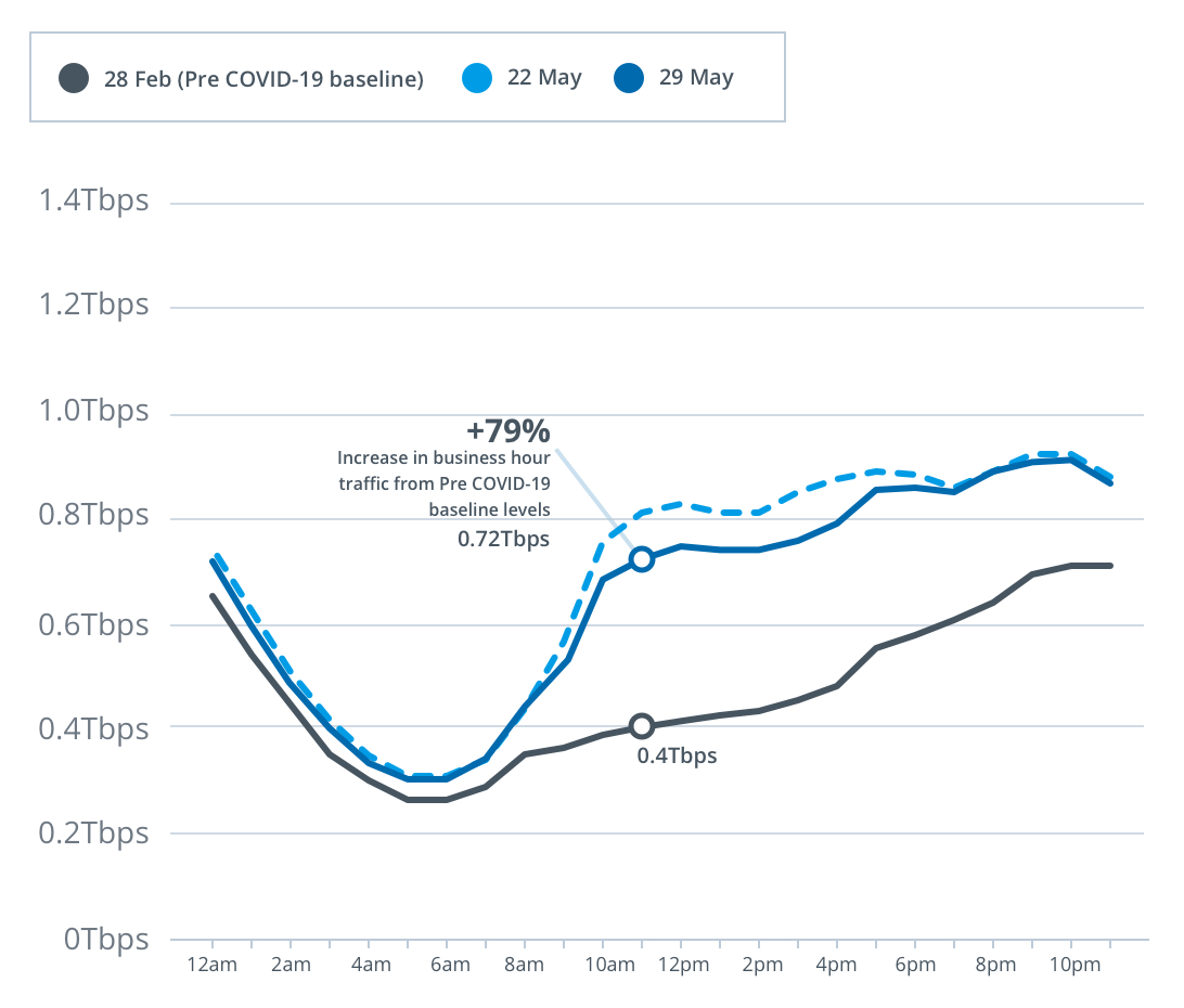 Upstream network usage on the nbn main wholesale service during business hours on 29 May 2020 was 79 per cent higher (as shown in the graph below at 11am) than the pre-COVID-19 baseline.