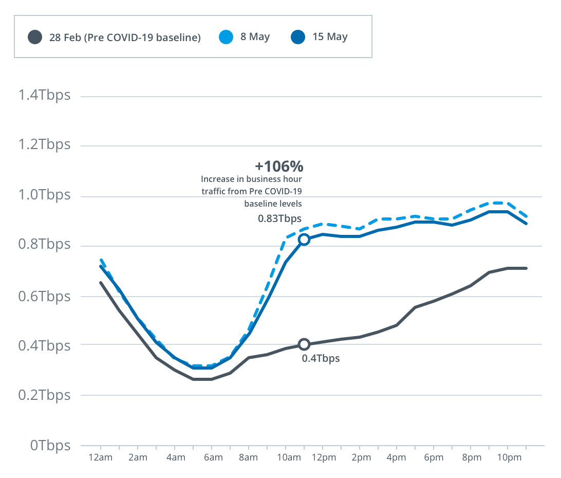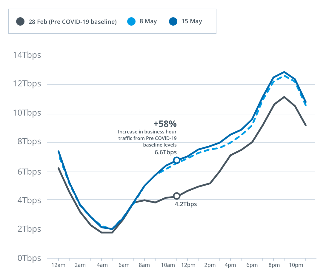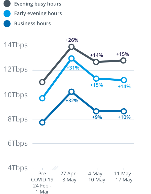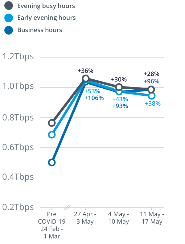 For the week beginning Monday, 11 May, peak download throughput compared to the pre-COVID-19 baseline also increased during daytime business hours, up 10 per cent to 8.5Tbps, and during early evening hours, up 14 per cent to 11.2Tbps, on the main nbn wholesale service.