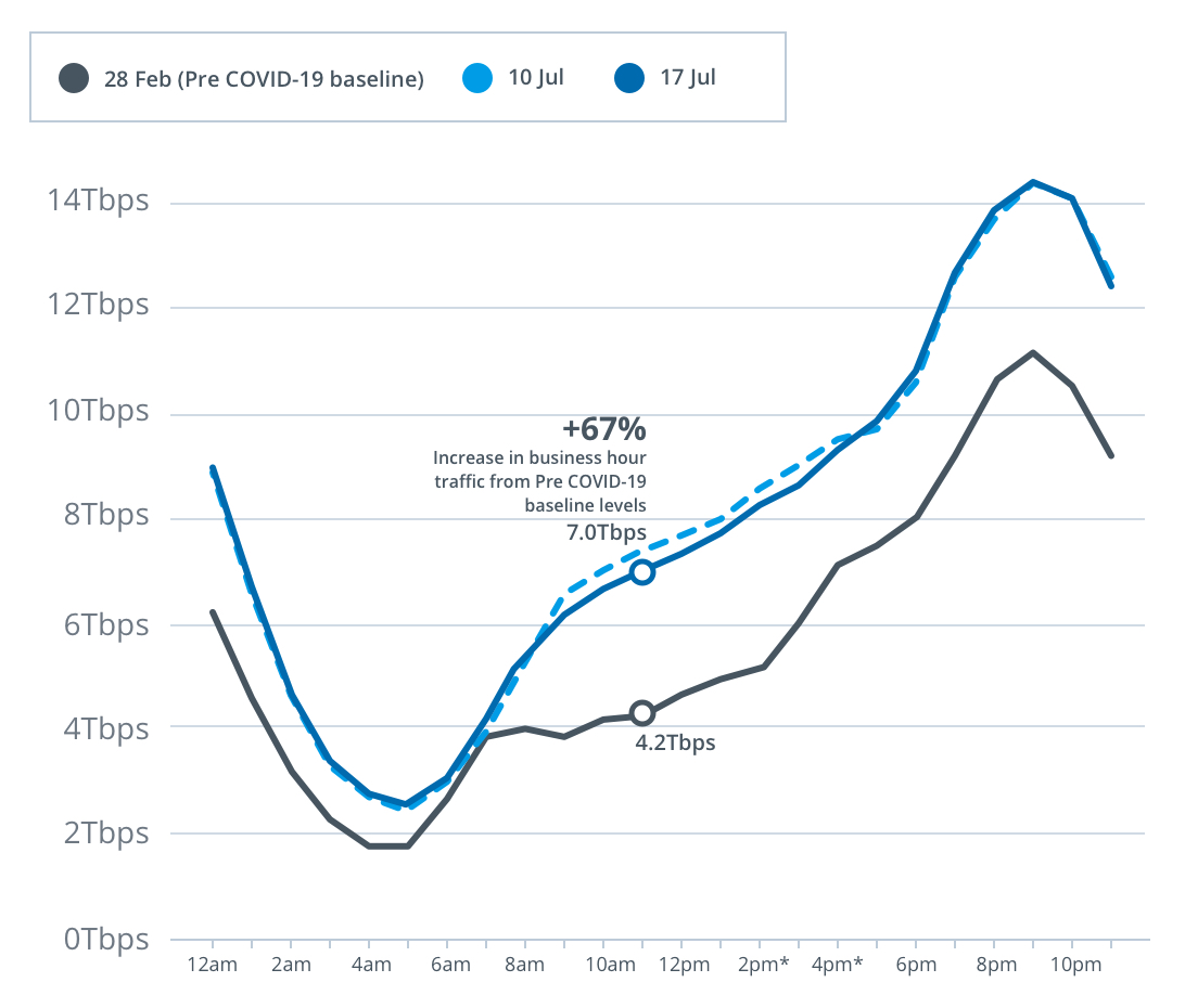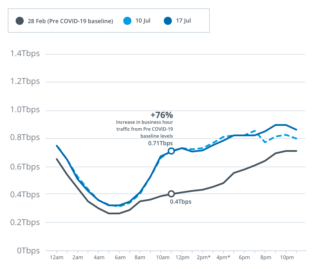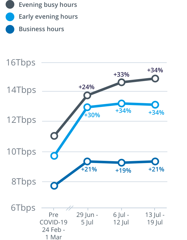Peak download throughput during the same week also increased during daytime business hours, up 21 per cent to 9.4Tbps, and early evening hours up 34 per cent to 13.1Tbps, compared to the pre-COVID-19 baseline.