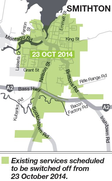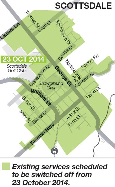 The first of several areas in Tasmania including Deloraine, George Town, Kingston Beach, St Helens, Sorell, and Triabunna are scheduled to be switched off from the existing copper network from 23 May 2014 with further areas planned to follow later in the year.