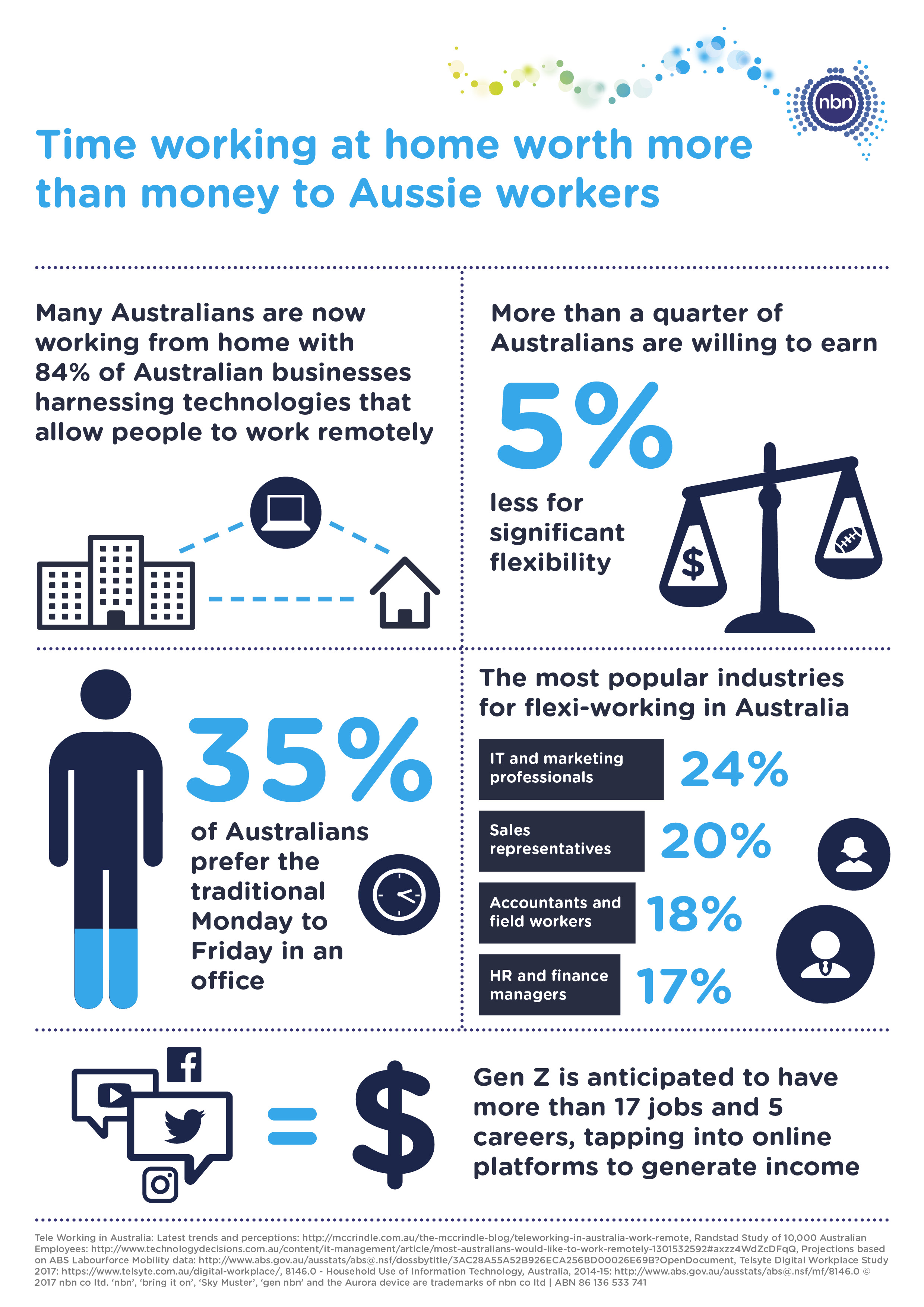 Aussies in search of a better work-life balance are turning to the internet to juggle their nine-to-five, with more than half the nation (51 per cent) willing to forgo a percentage of their pay in exchange for flexible working arrangements.