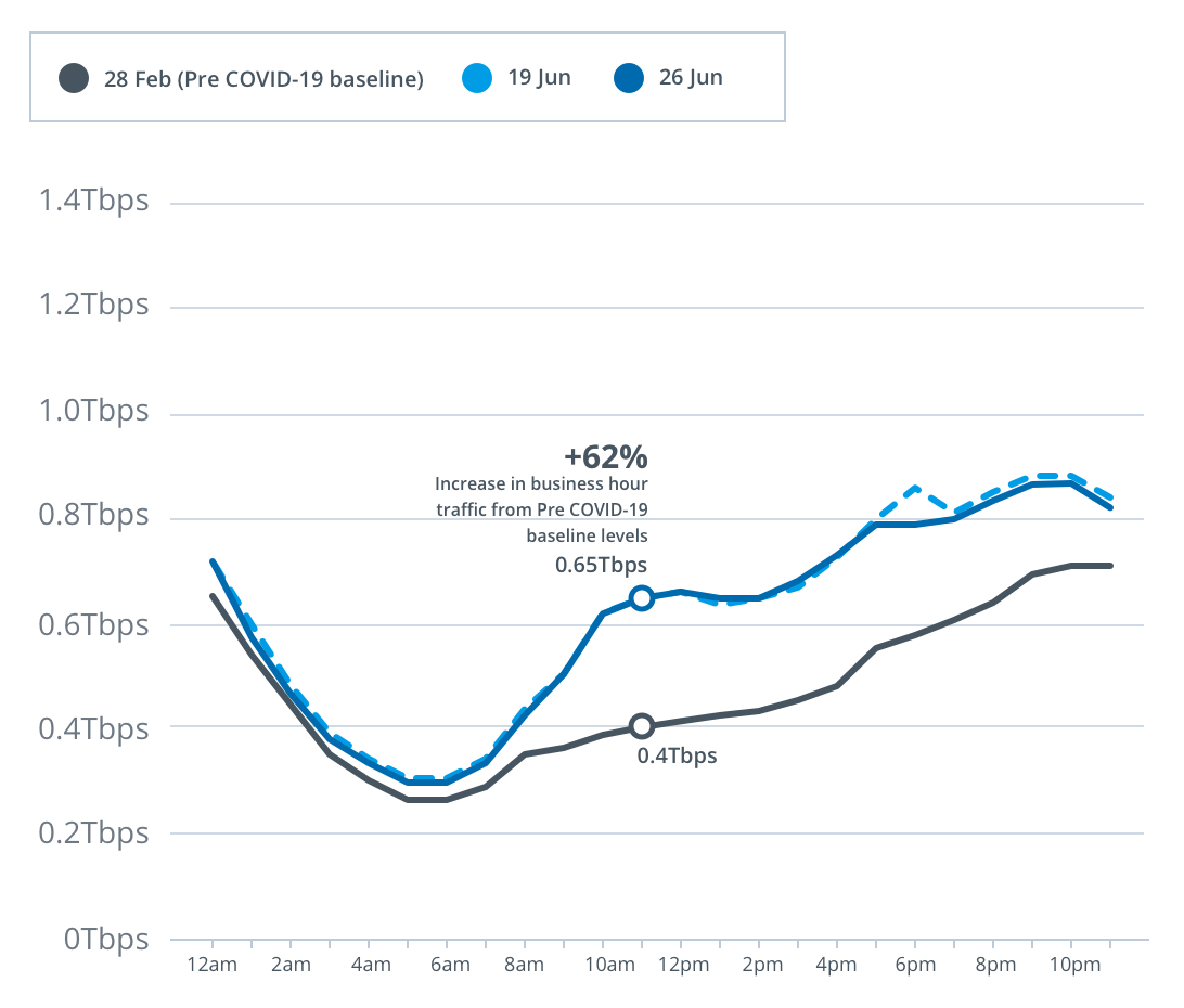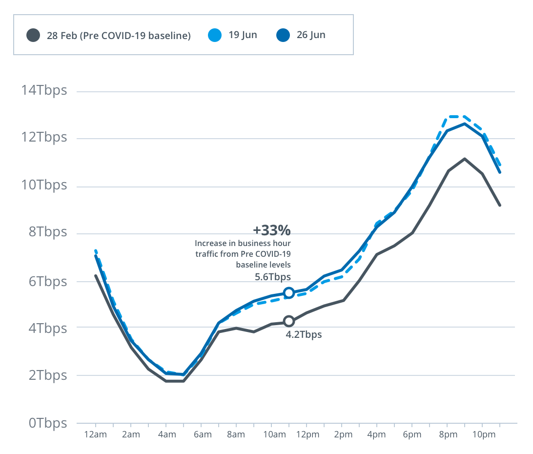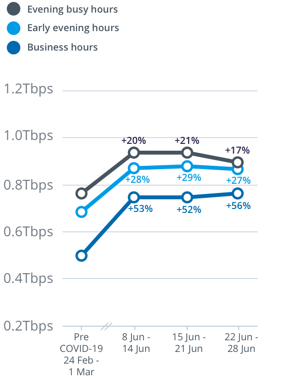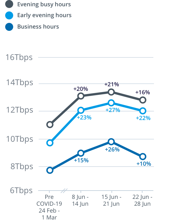 For the week from Monday, 22 June to Sunday, 28 June, peak download throughput (the measure of data flowing through the nbn™ network) during the busy evening period increased by 16 per cent to 12.8 Terabits per second (Tbps) on the main nbn wholesale service, compared to the last week of February (which nbn measures as its normal pre-COVID-19 baseline).